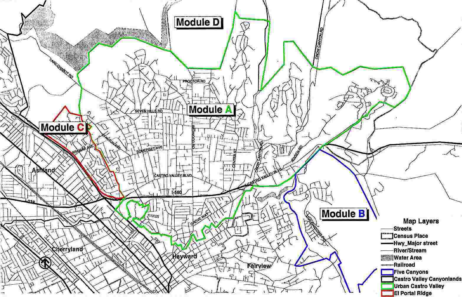 Module A. This module includes primarily the Castro Valley urban area and is bordered by the El Portal ridge (generally along the properties on Crest and Rolando Avenues) to the west, and generally along the area dividing Villareal Drive and Sunnyslope Avenue, including a portion of Eden Canyon Road to the east. The Castro Valley canyonlands and rural areas, including the East Bay Regional Park land, create the boundary to the north, and the city limits of Hayward to the south (Population: 50,000). Module B. This module, also known as the Five Canyons area, is bordered by the canyon and Fairview Avenue to the west, the back of the properties along the west side of Palomares Road to the east, Interstate 580 to the north, and generally along the jeep trail and property lines to the south (Population: 2,565). Module C. This module, also known as the El Portal Ridge area, is bordered by Foothill Boulevard to the west, the ridge (generally along the properties on Crest and Rolando Avenues) to the east, the Fairmont property line to the north, and Foothill Boulevard to the south (Population: 5,700). Module D.* This module, also known as the Castro Valley canyonlands and rural areas, is bordered by the city limits of Oakland and San Leandro and the unincorporated area known as Hillcrest Knolls and Foothill Boulevard to the west, the township line and the city limits of Dublin to the east, the county boundary to the north, and generally Castro Valley urban area to the south (Population: 500). (From EPS web page) *Module D was excluded from the study by LAFCO |