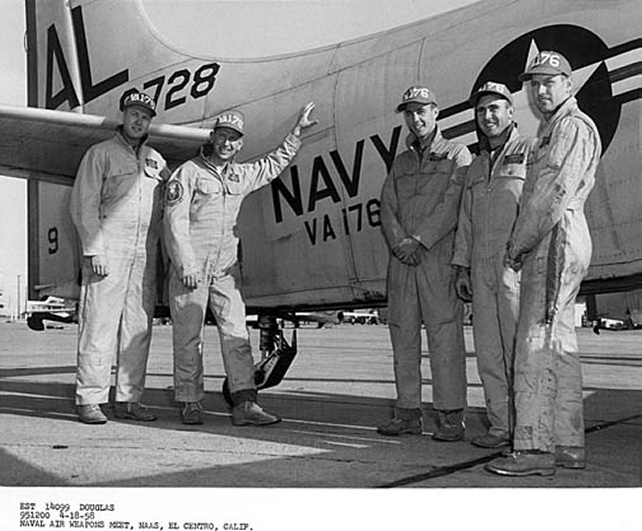 | Charles Ward on the left with VA-176 pilots at Naval Air Weapons Meet at NAAF El Centro. EST 14099 Douglas 18 April 1958. Attack Squadron VA-176 Reunion Association Inc. |